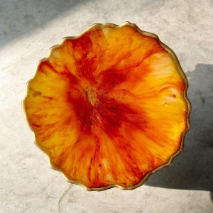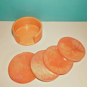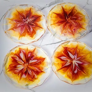 Pastel coral flower coasters with gold accents, handmade epoxy resin coasters or small jewelry trays, resin coaster set in orange pink, 4.5”